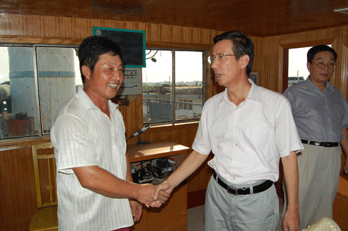 張書記(左二)與第七工程處皖吸五號(hào)船長(zhǎng)親切交談