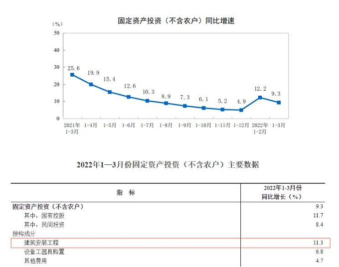 由上圖所示,1-3月,建筑安裝工程投資同比增長11.3%