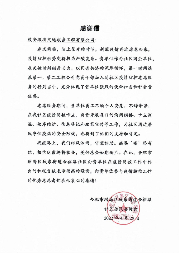 “第一時(shí)間選派第一、第二工程公司黨員干部加入到社區(qū)疫情防控志愿服務(wù)的行列當(dāng)中,充分體現(xiàn)了貴單位強(qiáng)烈的使命擔(dān)當(dāng)和社會(huì)責(zé)任感?!?月29日,公司收到了一封來(lái)自合肥市瑤海區(qū)城東街道合裕路社區(qū)的感謝信,信中對(duì)公司積極參與社區(qū)疫情防控工作表示由衷感謝。