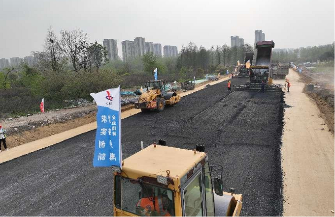 4月11日中午,青海路項目施工現(xiàn)場機(jī)械轟鳴、彩旗飄揚(yáng),項目道路水泥穩(wěn)定碎石試驗段順利動工,大型攤鋪機(jī)、壓路機(jī)、輸料車輛忙碌而有序地實施鋪設(shè)作業(yè),一條灰色的路面慢慢向前延伸。