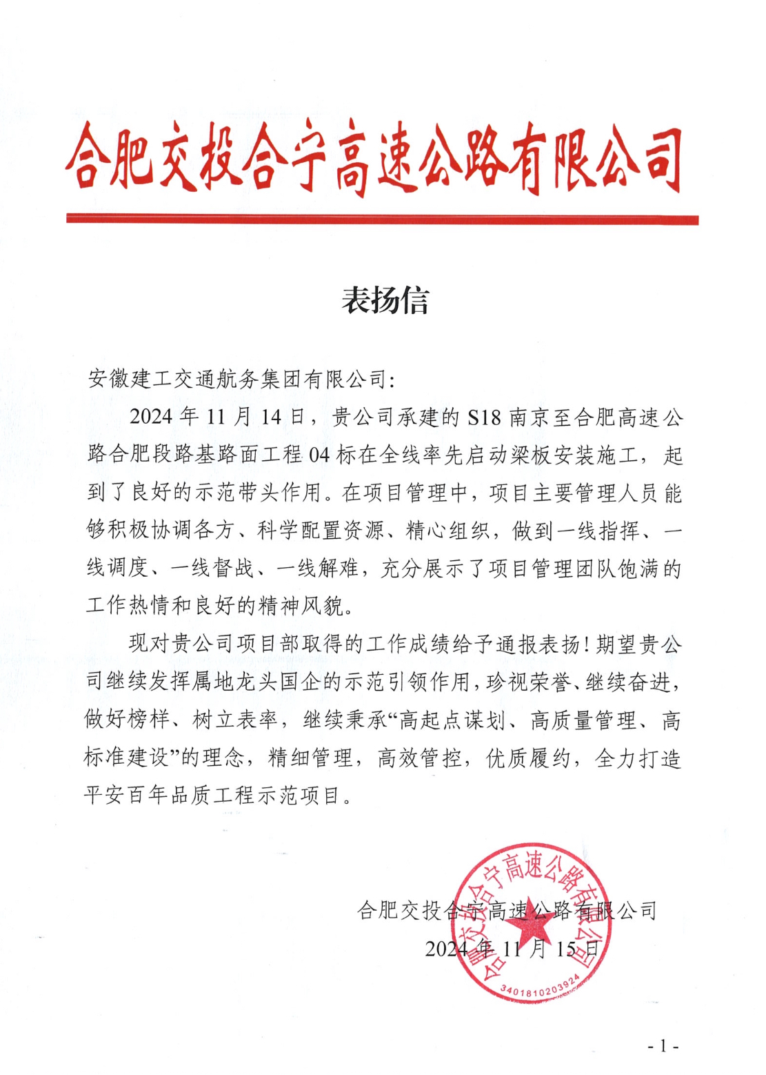 11月15日,S18南京至合肥高速公路合肥段路基路面工程04標(biāo)項(xiàng)目收到來自業(yè)主單位-合肥交投合寧高速公路有限公司表揚(yáng)信。