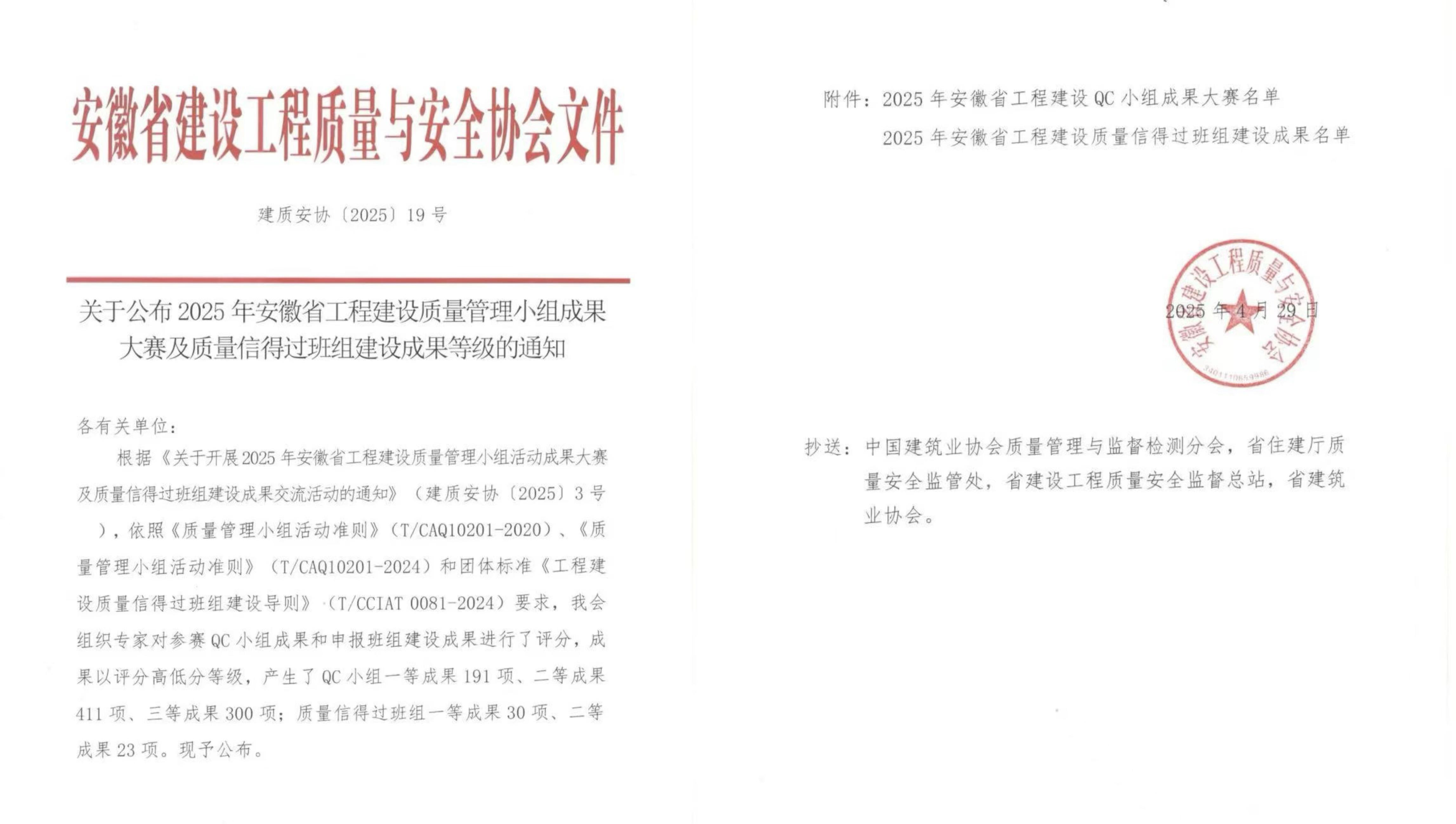 近日,2025 年安徽省工程建設(shè) QC 小組成果大賽評選結(jié)果揭曉。建工交航斬獲 2 項省級一等獎、9項省級二等獎、14項省級三等獎。