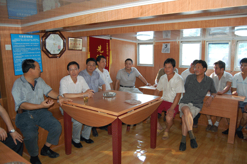 張書記(左二)與第七工程處皖吸五號(hào)船長(zhǎng)親切交談