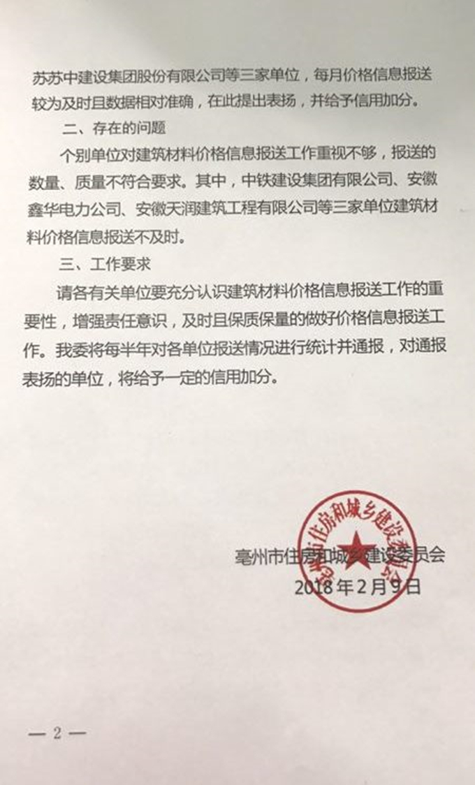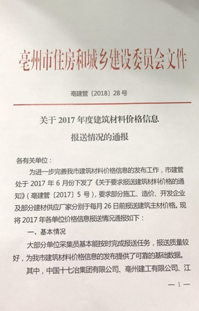 2018年2月9日,亳州市住房和城鄉(xiāng)建設(shè)委員會(huì)下發(fā)了《關(guān)于2017年度建筑材料價(jià)格信息報(bào)送情況的通報(bào)》(亳建管〔2018〕28號(hào)),文件中對(duì)亳州建工在2017年度建筑材料價(jià)格信息報(bào)送工作中積極主動(dòng)配合、每月按時(shí)報(bào)送建筑材料價(jià)格且數(shù)據(jù)準(zhǔn)確的做法表示肯定,并提出表?yè)P(yáng),給予信用加分的獎(jiǎng)勵(lì)。