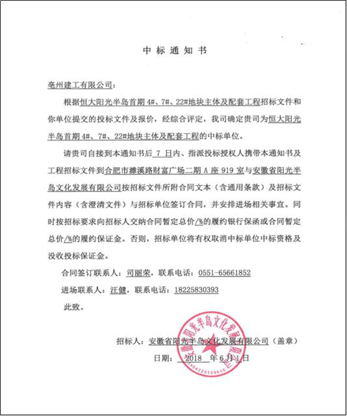 6月1日,亳州建工收到大型知名房企恒大地產(chǎn)集團(tuán)有限公司匠心打造的旅居巨作——“恒大陽(yáng)光半島項(xiàng)目”首期4#、7#、22#地塊主體及配套工程中標(biāo)通知書(shū),中標(biāo)金額3.6億元。