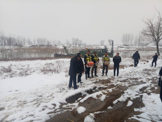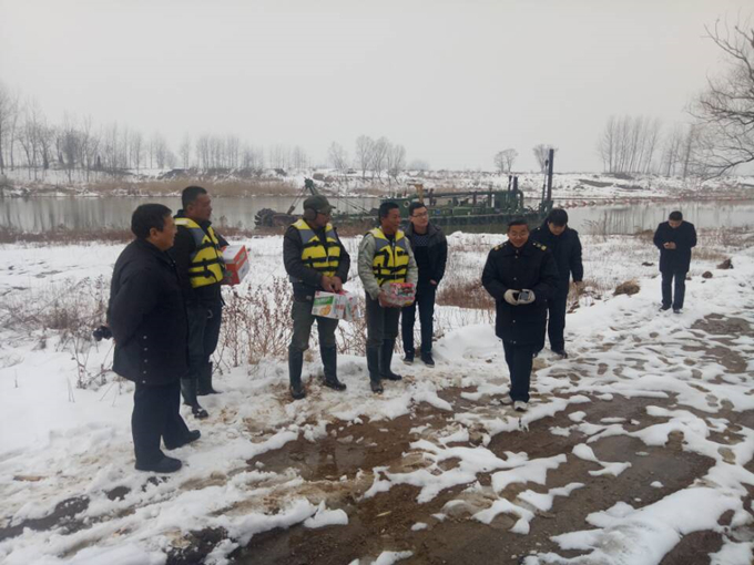 2018年1月6日,淮北市地方海事局副局長鐘德平一行蒞臨沱澮河項目部,要求切實做好冬季交通運輸安全生產(chǎn)工作,并到挖泥船現(xiàn)場看望慰問船上員工。
