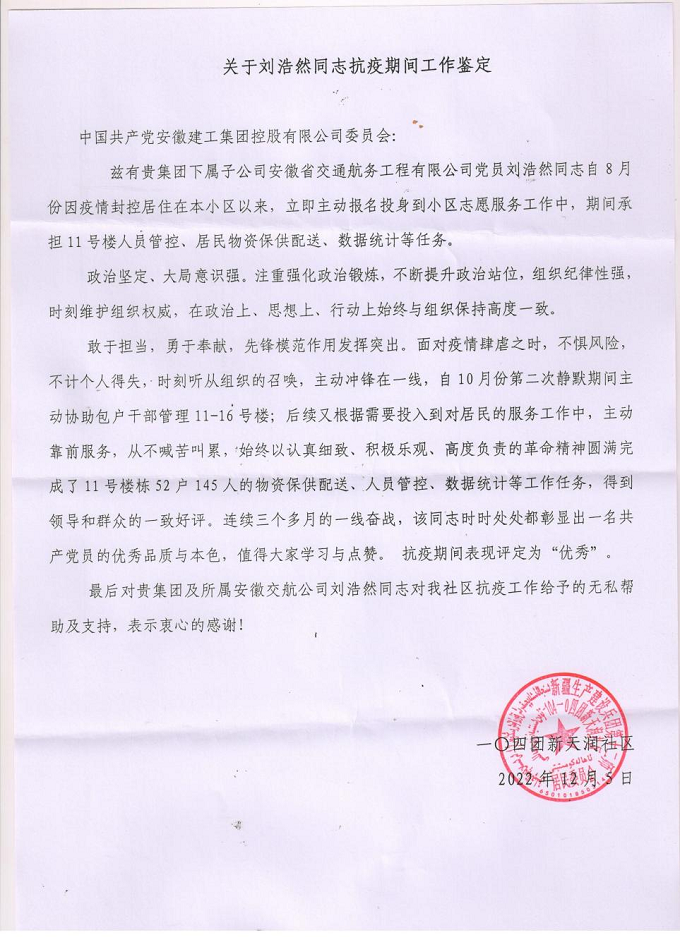 作為一名黨員,劉浩然沖鋒在前,與社區(qū)志愿者擰成一股繩,始終堅(jiān)持奮戰(zhàn)在疫情防控第一線,彰顯了國(guó)企員工的責(zé)任與擔(dān)當(dāng),獲得了屬地政府的一致肯定與好評(píng)。