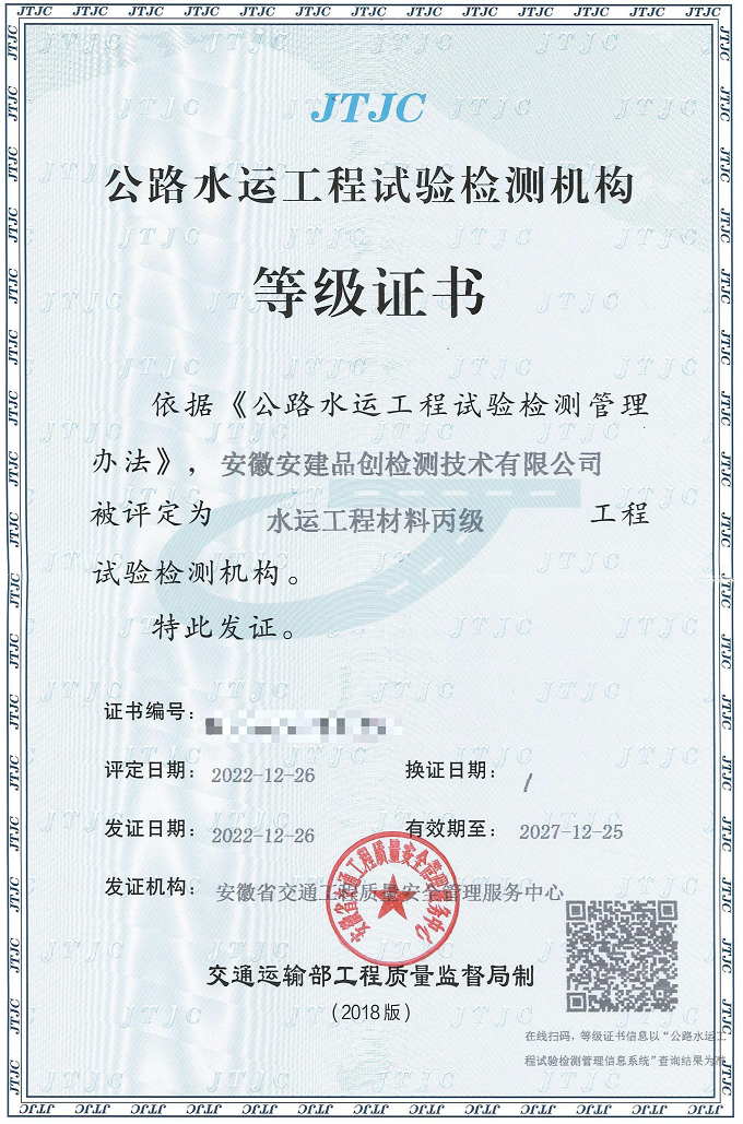 12月26日,品創(chuàng)檢測(cè)公司榮獲水運(yùn)工程材料丙級(jí)資質(zhì),此次丙級(jí)資質(zhì)的取得標(biāo)志著品創(chuàng)檢測(cè)公司“十四五”發(fā)展規(guī)劃邁上新臺(tái)階,同時(shí)也為進(jìn)一步提升水運(yùn)行業(yè)等級(jí)資質(zhì)以及開(kāi)拓水運(yùn)工程檢測(cè)領(lǐng)域奠定了堅(jiān)實(shí)的基礎(chǔ)。