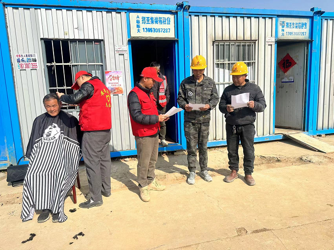 潭沖河家園項(xiàng)目發(fā)動青年志愿者們?yōu)轫?xiàng)目工人發(fā)放文明宣傳手冊,講解宣傳合肥市民公約(守則),同時(shí)團(tuán)支部組織志愿者服務(wù)活動,為工人提供義務(wù)理發(fā)。