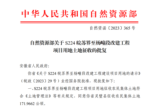 近日,在靈璧縣人民政府及各單位的共同努力下,建工交航靈璧S224皖蘇界至楊疃段改建工程項(xiàng)目用地土地征收成功取得自然資源部批復(fù),為加快項(xiàng)目建設(shè)提供了用地保障。
