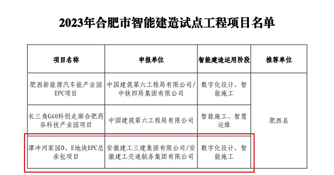 近日,合肥市智能建造試點(diǎn)城市建設(shè)領(lǐng)導(dǎo)小組辦公室公布2023年合肥市智能建造試點(diǎn)工程項(xiàng)目名單,建工交航承建的潭沖河家園D、E地塊EPC總承包項(xiàng)目位列其中,標(biāo)志著公司運(yùn)用智能建造技術(shù)在項(xiàng)目施工、生產(chǎn)、管理等全過(guò)程數(shù)字化應(yīng)用方面取得了階段性成果。