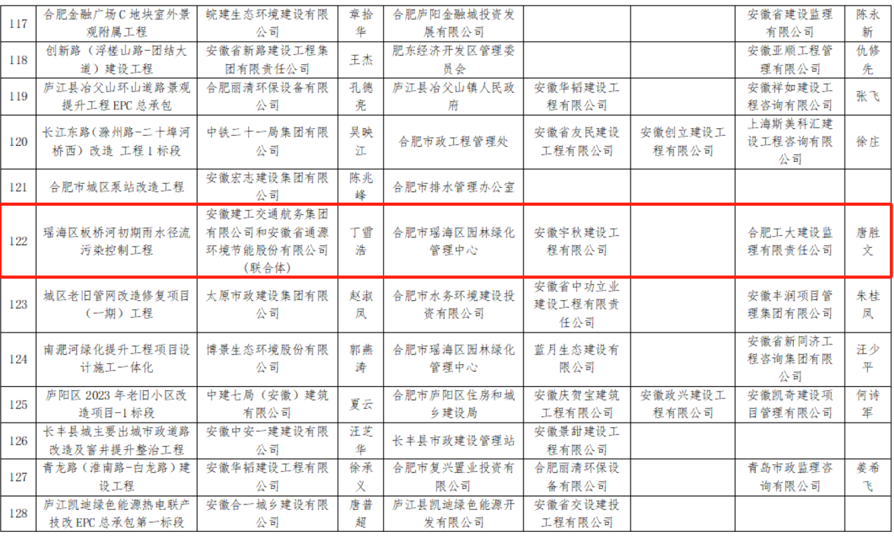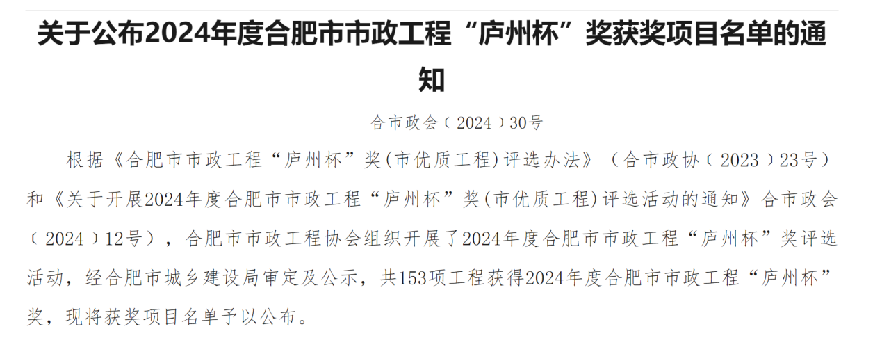近日,經合肥市城鄉(xiāng)建設局審定,合肥市市政工程協(xié)會正式公布2024年度合肥市市政工程“廬州杯”獲獎項目名單,我公司承建的瑤海區(qū)板橋河初期雨水徑流污染控制工程項目順利通過評審,榜上有名。